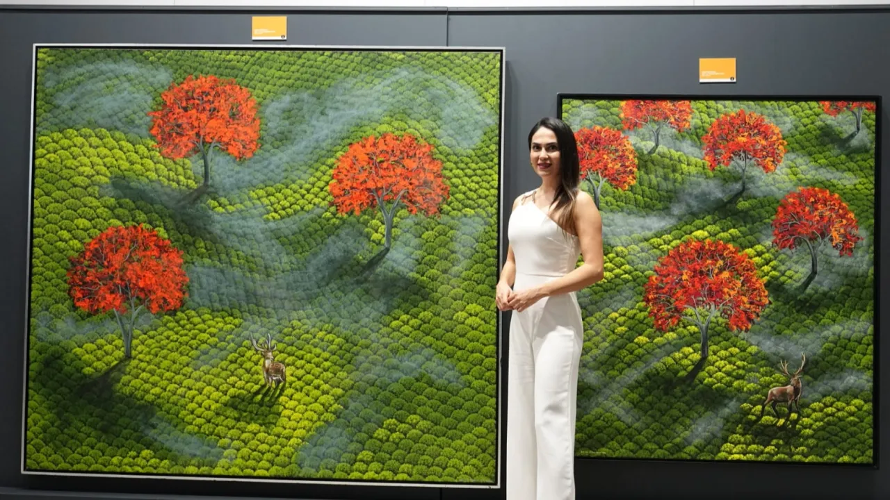 Serginin genç isimlerinden Melisa Özgür, geometrik soyutlama ve kozmik motifleri buluşturan kompozisyonlarıyla dikkat çekiyor. Katmanlı yüzeyler ve güçlü renk enerjisi, izleyiciye yeni bir görsel deneyim sunuyor.