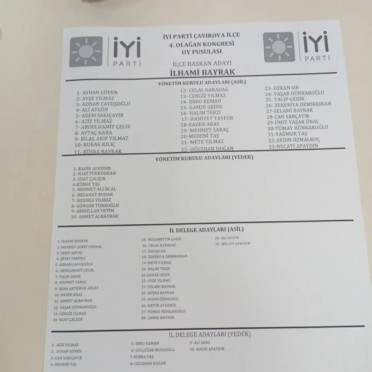 Divan başkanı olarak İYİ Parti Kocaeli Önceki Dönem Başkanı Nusret Acur divan üyeleri olarak ise Mustafa Sarı, H. Pınar Demirel, Necati Apaydın seçildi. Kongrenin siyasi bölüm kısmında konuşan İYİ Parti Kocaeli İl Başkanı Mehmet Kamil Şirin, “31 Mart seçimlerinde bayrağı en üste taşıyan Şevki Demirci ve Sadık Güvenç’e teşekkür ederim. Çayırova’da aldığımız seçimi masa başı oyunlarınsa kaybettik. Sandıklarda yeterli direnci gösteremedik. Milletin iradesinin sandığa yansımasını beceremiyoruz. İlhami Bayrak çok başarılı bir ilçe başkanımız. Sandıklara sahip çıkacak teşkilatları yaratmalıyız. Partimiz çok iyi bir yolda. Biz artık bir ideoloji partisi olduk. Ülkeyi yönetecek, Çayırova ve Kocaeli’ni yönetecek ola kadrolar bu kadrolardır. Herkesin sesi olmaya devam edeceğiz” dedi.