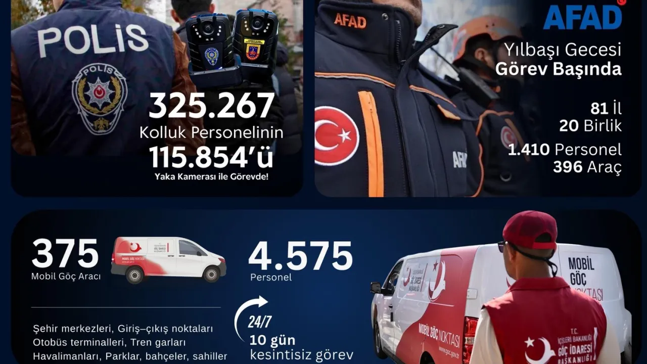 İçişleri Bakanı Ali Yerlikaya, yılbaşı sürecinde ülke genelinde alınan güvenlik tedbirlerini açıkladı. 30 Aralık 2025 - 2 Ocak 2026 tarihleri arasında 325 bin personel, 44 bin ekip ve binlerce teknolojik unsurla sahada olacak.