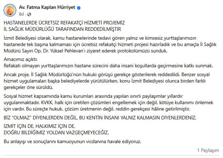 İzmit Belediye Başkanı Fatma Kaplan Hürriyet, kamu hastanelerinde yalnız ve kimsesiz hastalara yönelik ücretsiz refakatçi hizmeti projesinin İl Sağlık Müdürlüğü tarafından reddedildiğini açıkladı.