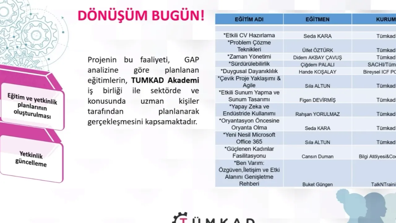 TÜMKAD Yönetim Kurulu'nun ve üyelerinin katıldığı toplantının açılış konuşmasını yapan TÜMKAD Yönetim Kurulu Başkanı Ülfet Öztürk, konuşmasında hem projenin başlangıcındaki heyecanı hem de bugüne kadar geçen süreçte yaşanan gelişmeleri aktararak, 'Bugün burada sadece bir projenin kapanışı için değil, çok daha büyük bir hikayenin devamı için bir araya geldik. 'Dönüşüm Bugün' projesini başlatırken amacımız çok netti. Belirli nedenlerle sektörden ayrılmış kadın mühendislerimize, mesleklerine dönüş yolculuklarında destek olmak istedik. Çünkü biliyoruz ki, sektörden ayrılan her kadın mühendisle birlikte toplumun üretim gücü ve ülkenin potansiyeli de azalıyor' dedi.
