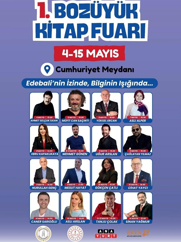 Yüksel Ercan’ın misafir olacağı 1.Bozüyük Kitap fuarı 04-15 Mayıs 2026 tarihleri arsında “Edebali’nin izinde, Bilginin ışığında” sloganı ile Bozüyük Cumhuriyet Meydanında gerçekleşecek.